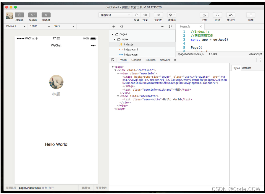 点击工具上的编译按钮,可以在工具的左侧模拟器界面看到这个小程序的表现,也可以点击预览按钮,通过微信的扫一扫在手机上体验你的第一个小程序。
