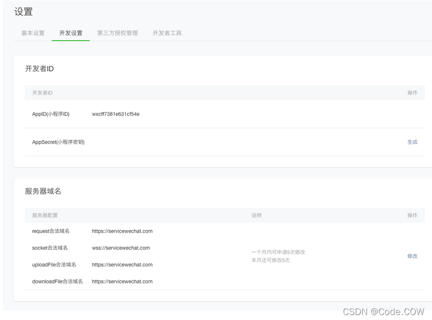 登录 小程序后台 ,我们可以在菜单 “开发”-“开发设置” 看到小程序的 AppID 了 。