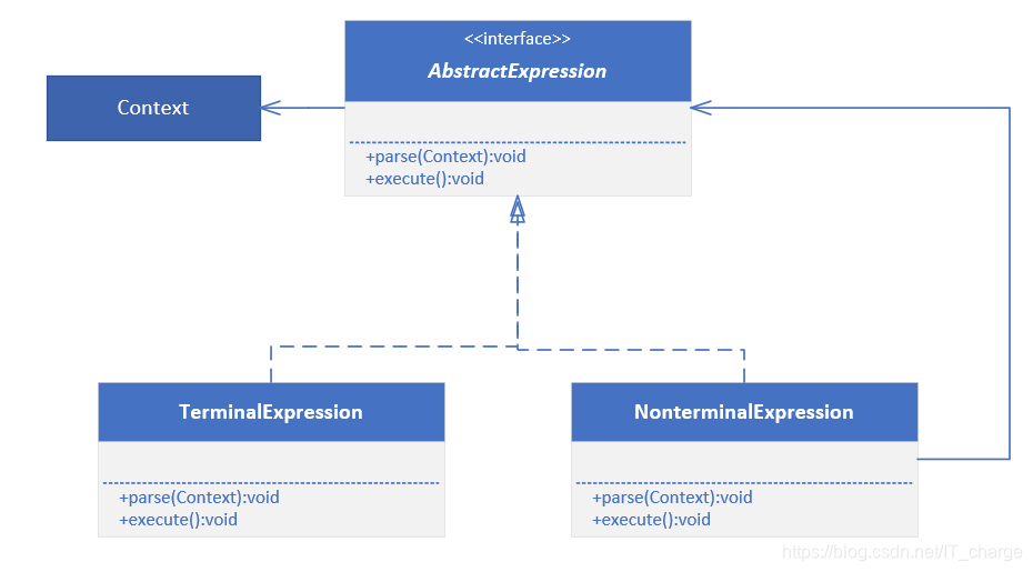 ②终结符表达式(TerminalExpression):实现抽象表达式接口的类,该类将接口中的解释操作实现为与文法中的终结符相关联的操作,即文法中每个终结符号需要一个终结符表达式类;