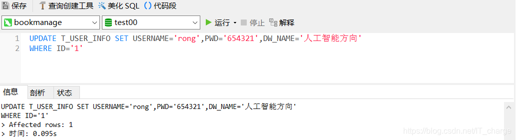 UPDATE T_USER_INFO SET USERNAME='rong',PWD='654321',DW_NAME='人工智能方向'