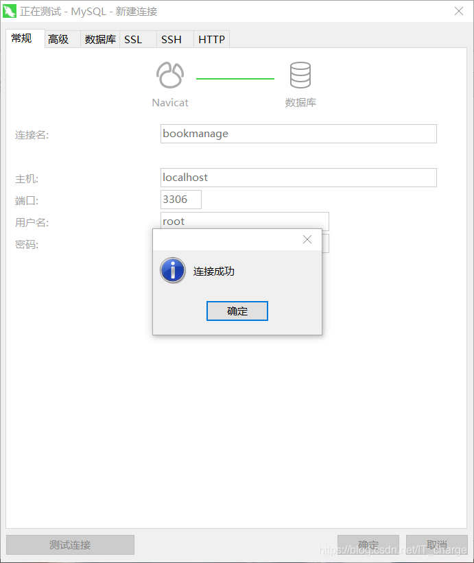 点击“连接”按钮,弹出“连接”对话框,在该对话框中输入相关信息,如主机名、端口等。如果是本地数据库,则在“主机”文本框中输入“localhost”,在“端口”文本框中输入“3306”,“用户名”和“密码”分别为本地 MySQL 数据库对应值,“用户名”默认为 root,“密码”默认为“123456”,连接名这里我连接的是上一篇文章创建的数据库“bookmanage”。