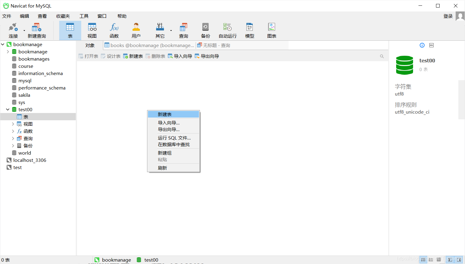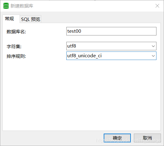 然后再弹出的 “新建数据库” 对话框中输入数据库名、字符集和排序规则,和第一种方法提到的一样,将数据库名设置为“test00”,将字符集设置为“utf8”,将排序规则设置为“utf8_unicode_ci”