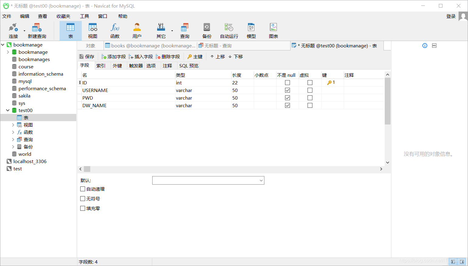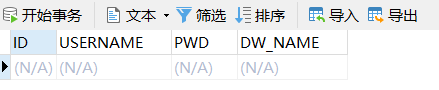 假设新建表为 T_USER_INFO,单击“添加栏位”按钮向表中插入响应字段,插入的字段包括:ID(序号)、USERNAME(用户名)、PWD(密码)、DW_NAME(单位名称);同时还可以设置主键、非空属性、添加注释等。