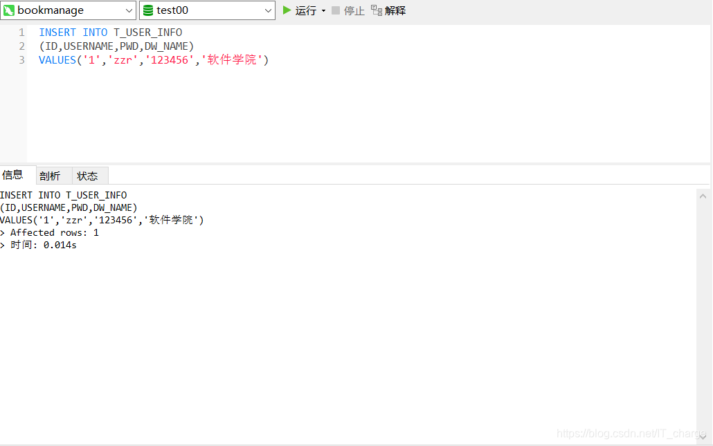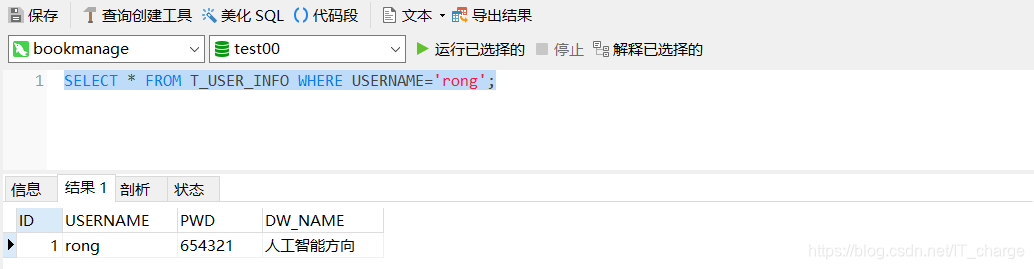 查询表 T_USER_INFO 中 USERNAME 为 “rong” 的信息,代码如下: