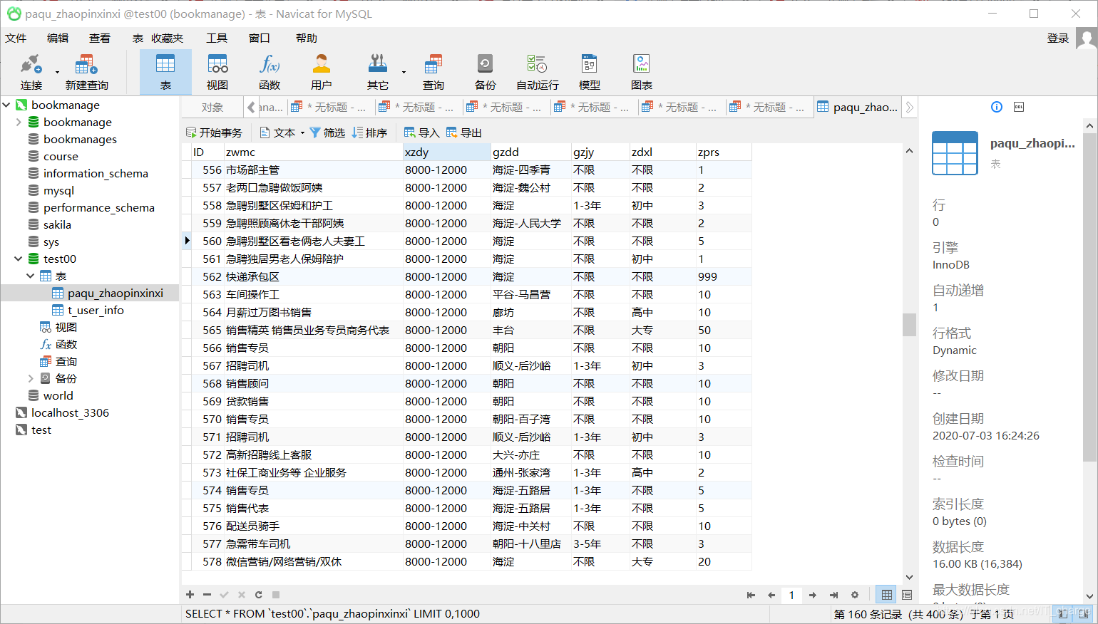 CREATE TABLE `PAQU_ZHAOPINXINXI`(