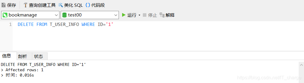 删除表 T_USER_INFO 中 ID 值为 “1” 的信息,代码如下: