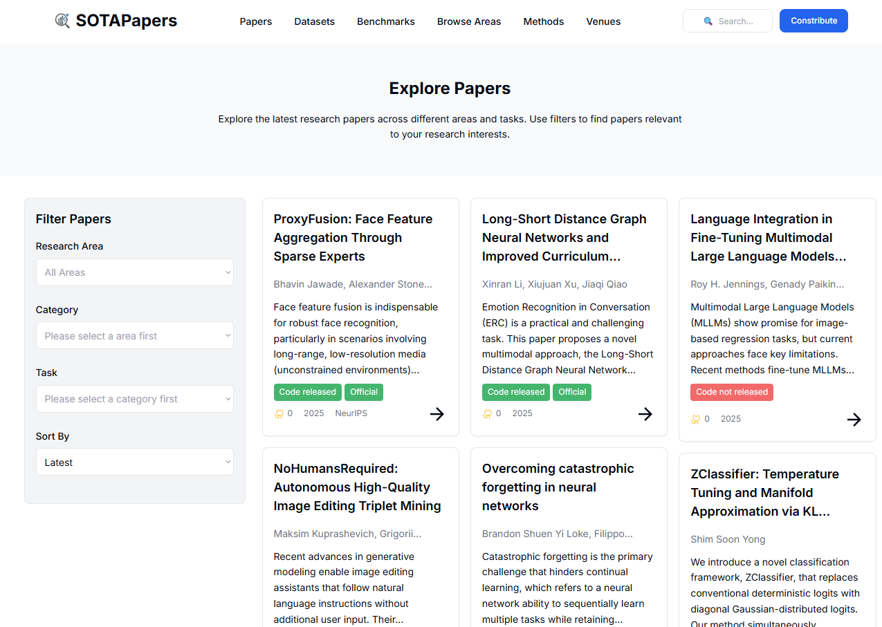 最近发现之前一直用的不错的 Paper with code 挂了,官方推荐的替代 https://huggingface.co/papers/trending 有一说一真的难用。。逛了 Paper with code 团队的 github,发现一个 issue 里面有个宝藏网站 Research Papers | Discover the Latest in AI & Machine Learning