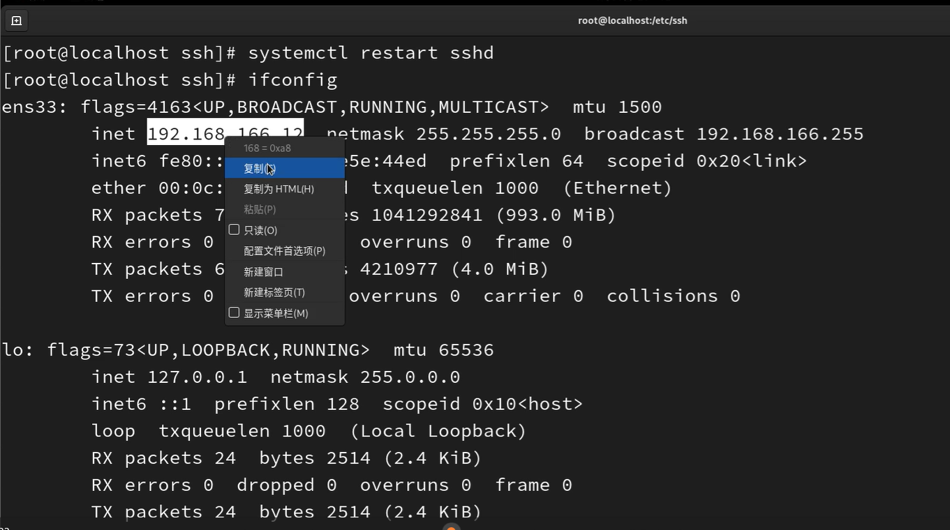 回到Liux系统命令栏,输入ifconfig,点击右键复制自己的IP地址