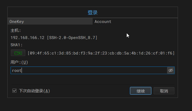 点击Account,输入用户(root),输入密码,完成连接!