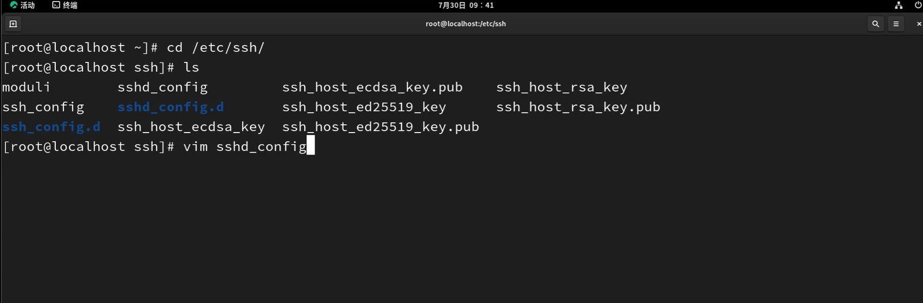 输入命令:cd /etc/ssh/, 输入ls查看。