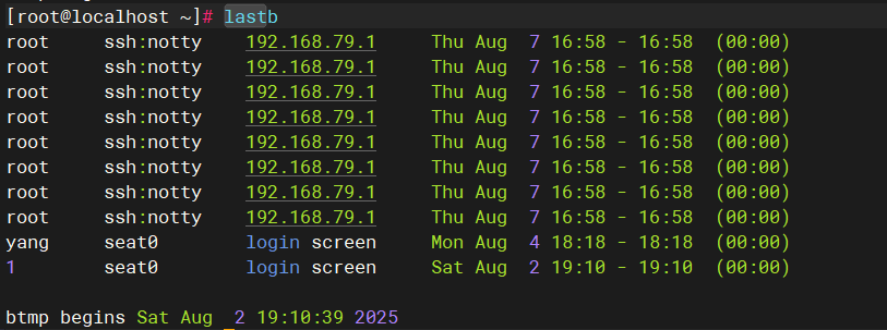 lastb命令可以从日志文件/var/log/btmp中读取信息,并显示用户登录失败的记录用于发现系统登录异常。此命令要求root用户才可以执行,lastb可用参数与last命令参数相同。