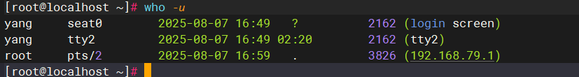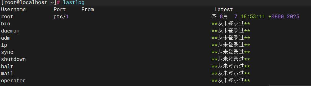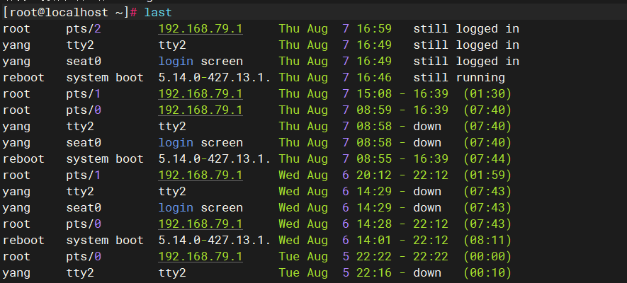 last命令可以查看登录用户列表,last命令实际上从日志文件/var/log/wtmp读取信息并显示用户最近的登录列表。此命令普通用户也可以执行。
