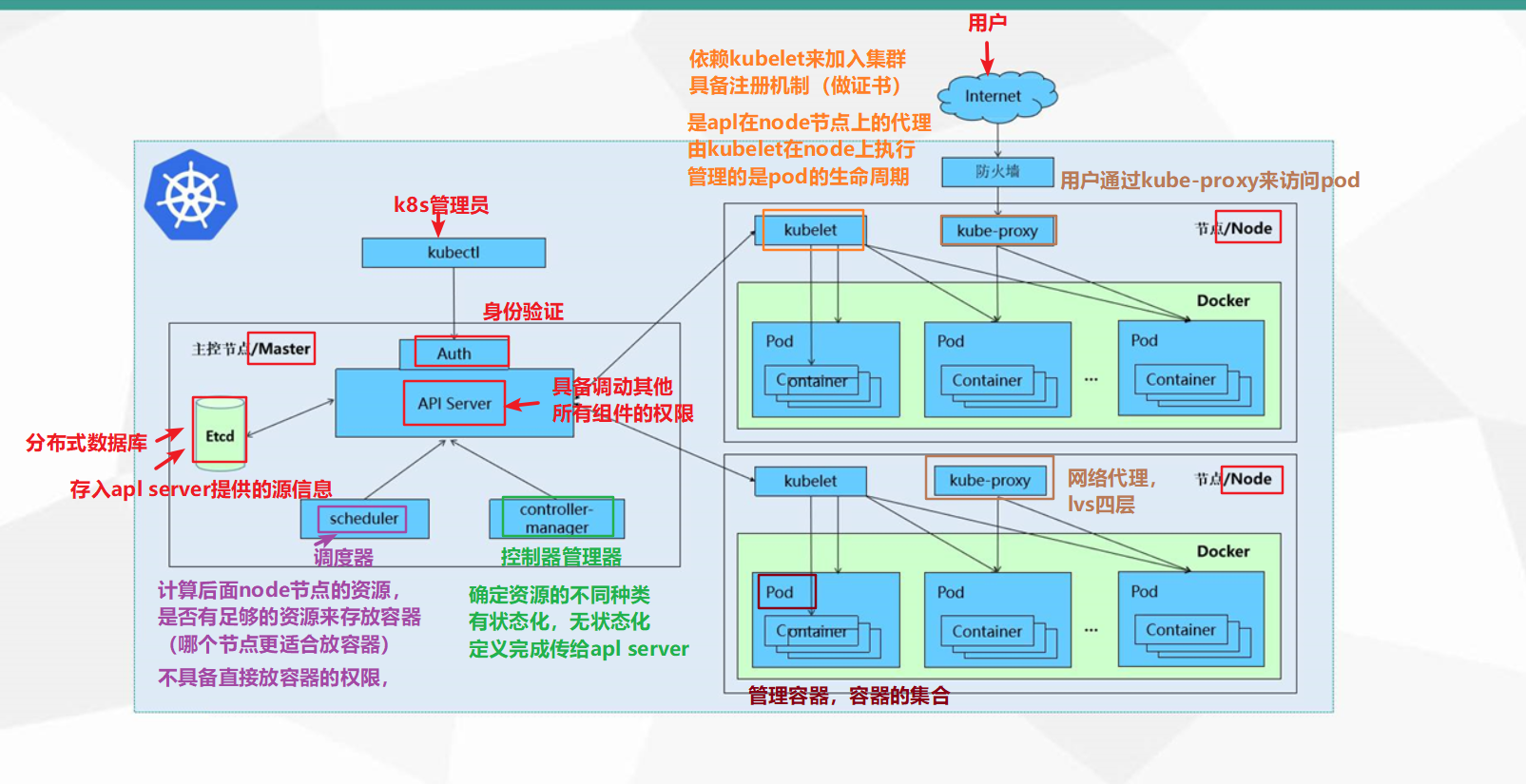 - 可以理解成 API Server 是 K8S 的请求入口服务。API Server 负责接收 K8S 所有请求(来自 UI 界面或者 CLI命令行工具), 然后根据用户的具体请求,去通知其他组件干活。可以说 API Server 是 K8S 集群架构的大脑。