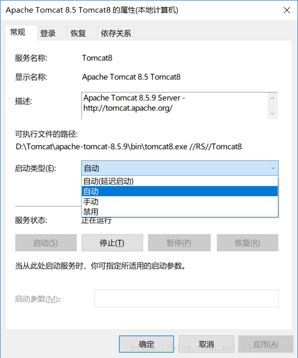 Tomcat8服务最开始的状态是没有运行 , 启动类型为手动。这是右键点击此服务,选择属性,将手动改为自动。