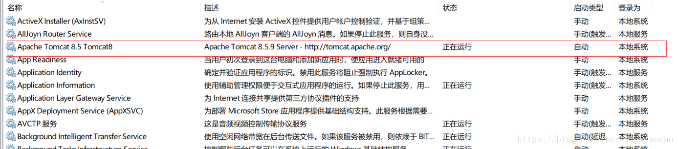 The service 'Tomcat8' has been installed.这个之后就成功了,其中service.bat install 后面的Tomcat8是服务器名称,这个也可以不指定。配置文件service.bat有写。4、接下来按Windows+r后输入services.msc。可以看到Tomcat8的服务,如下图: