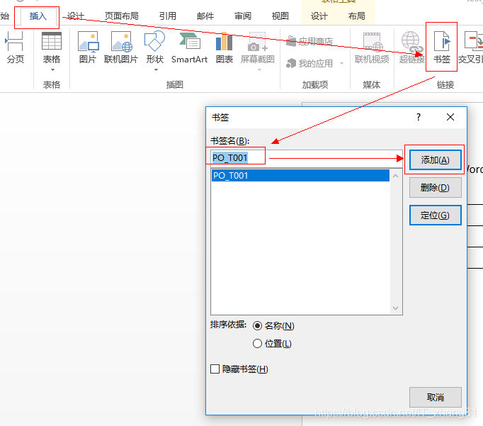 在选中的情况下,点击菜单栏插入-书签--书签名设置为PO_d1--点击添加(书签名称格式为PO_开头,比如自己设置的书签名为PO_T001,那么记得将第三步中的DataRegion d1 = doc.openDataRegion("PO_d1");改为 DataRegion d1 = doc.openDataRegion("PO_T001");)。