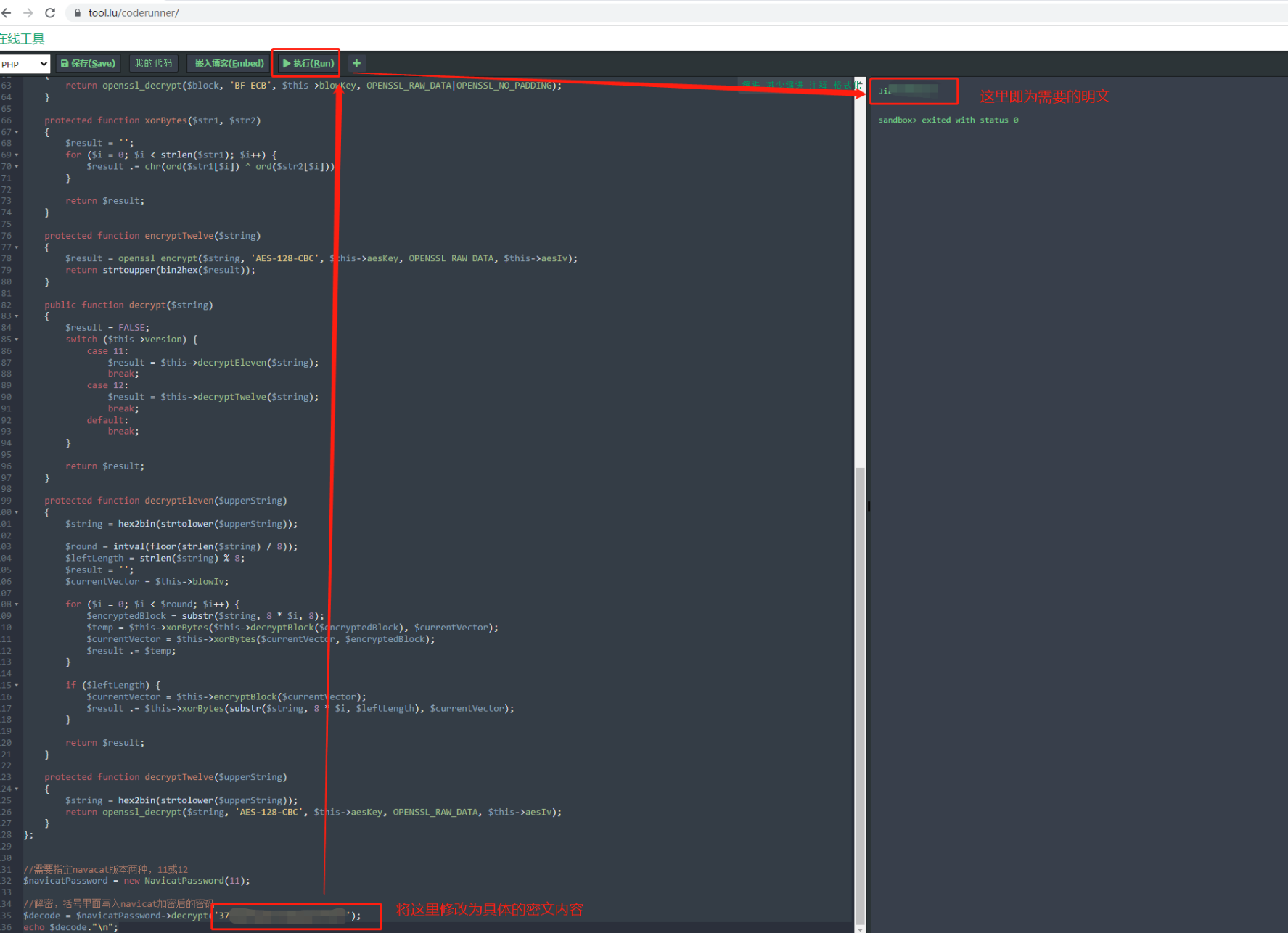 但是该密码为密文,怎么获取到它对应的明文呢?需要用到网上的一段PHP代码,该代码可以通过在线运行:https://tool.lu/coderunner/