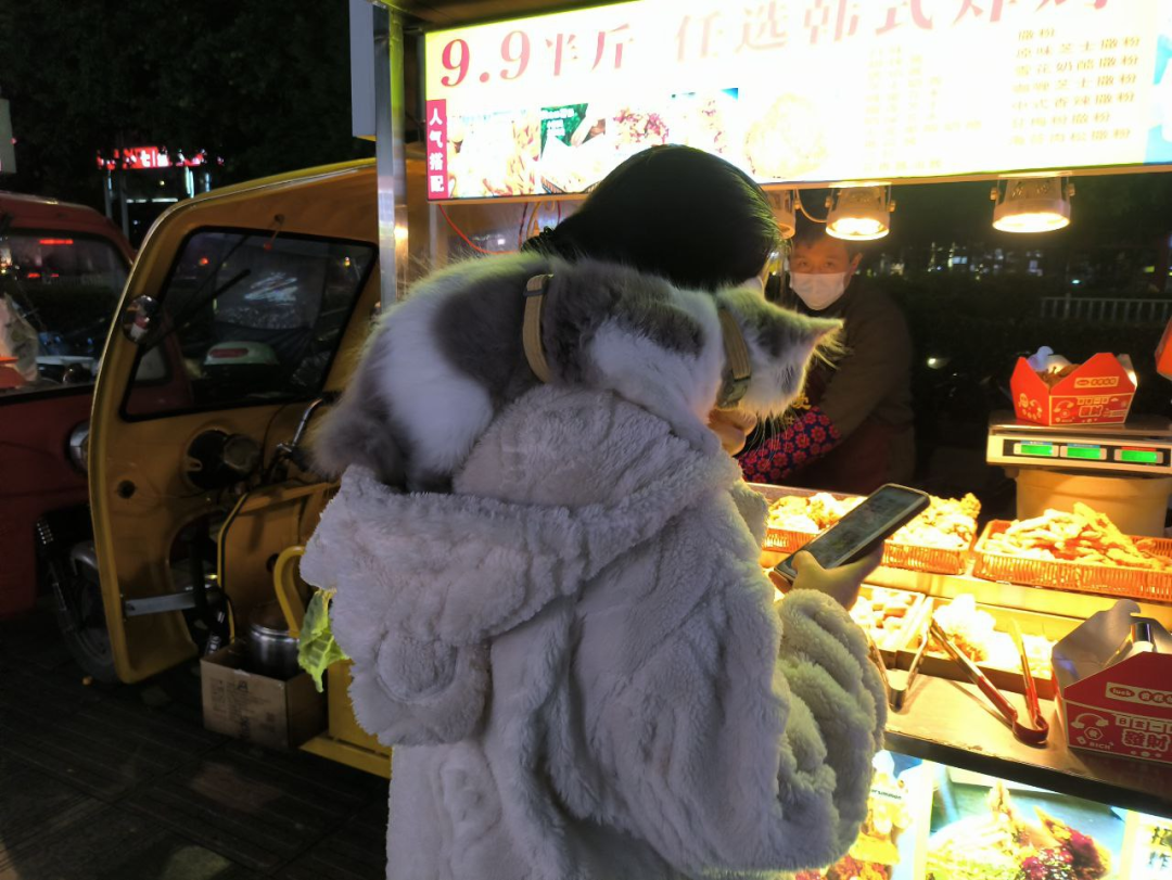路上看到一个穿着睡衣的女孩子,肩上趴了一只布偶猫,看起来很可爱。
