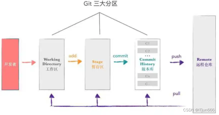 对应的git仓库分区,分为三个区。工作区(你就是你的工作代码)暂存区(暂存你的代码通过状态可以查看对应的暂存内容可以更改)历史区(版本库)(通过日志可以查看你的提交记录最终记录存在历史区历史区不能更改)