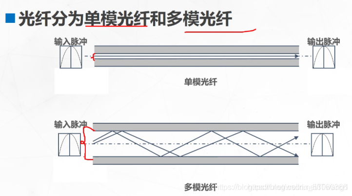 其中,光纤传输还可以细分为单模光纤和多模光纤,两者在适用场景、核心直径、光源、成本、能效等方面有所区别,如下图