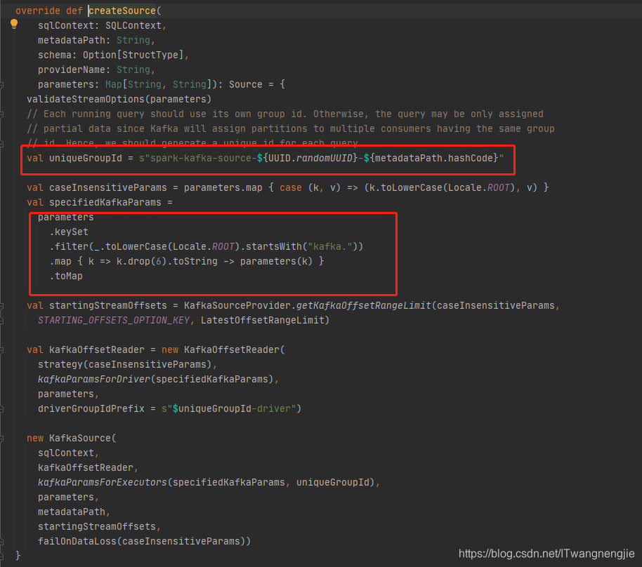 如果要对默认参数进行修改或者添加新的配置,通过 option("Kafka.xx","") 进行设置。由于在KafkaSourceProvider 类对Kafka设置的参数做了过滤处理 因此,设置Kafka参数时,必须以kafka. 前缀开始:
