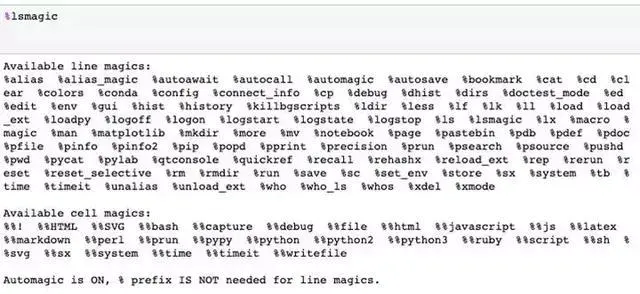 Magic命令是Jupyter Notebook中的一组便捷功能,它们旨在解决数据分析中一些常见的问题。你可以用%Ismagic来查阅所有的Magic 命令。