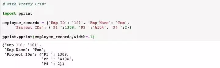 如果你想生成美观的数据结构,pprint是首选的模块。它在输出字典数据或JSON数据时特别有用。下面来看一下print 和pprint输出的一个例子: