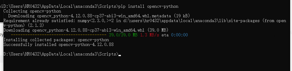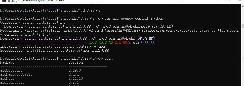 安装 opencv-python输入:pip install opencv-python 也可以指定版本号安装:pip install opencv-python==3.4.15 不加版本号默认最新的,需注意:3.4.2+会涉及到专利问题