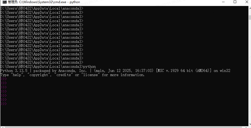 安装好后,进入anaconda安装目录下,输入python出现以下,表示安装成功