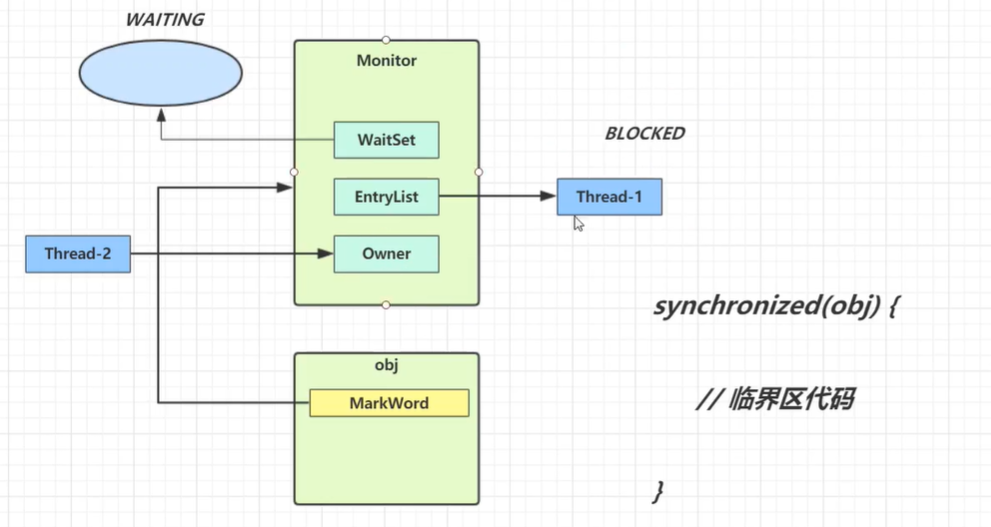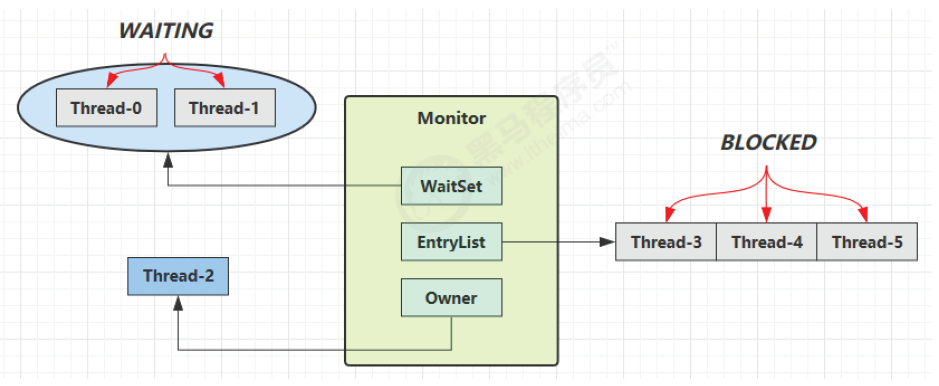 - 在 Thread-2 上锁的过程,Thread-3、Thread-4、Thread-5 也执行 synchronized(obj),就会进入 EntryList (等待队列),此时线程状态为 BLOCKED阻塞