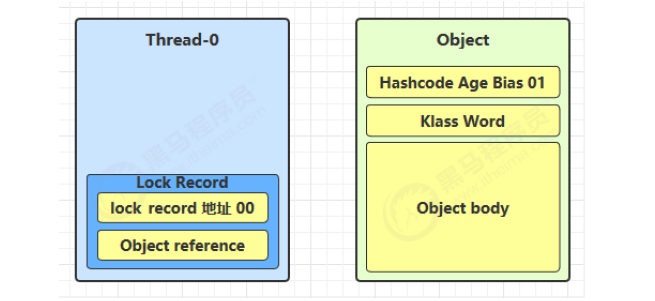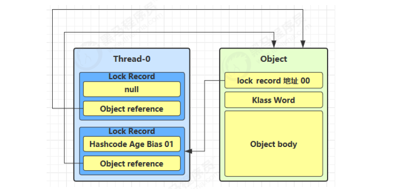- 在代码进入同步块时,JVM 会在当前线程的栈帧中创建一个名为锁记录 的空间,用于存储对象当前的 Mark Word 副本。