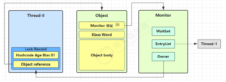 - Thread-1 加轻量级锁失败,进入锁膨胀流程:为 Object 对象申请 Monitor 锁,通过 Object 对象头获取到持锁线程,将 Monitor 的 Owner 置为 Thread-0,将 Object 的对象头指向重量级锁地址,然后自己进入 Monitor 的 EntryList BLOCKED