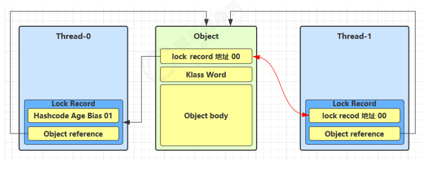 - 当 Thread-1 进行轻量级加锁时,Thread-0 已经对该对象加了轻量级锁