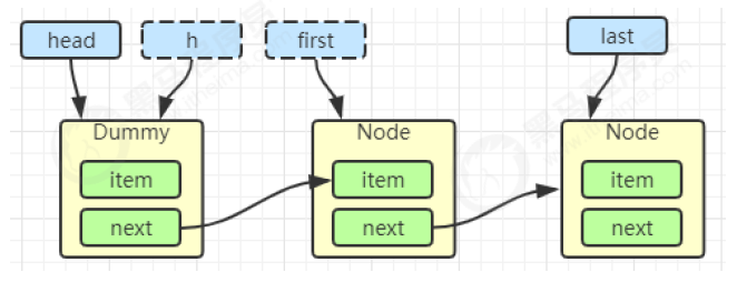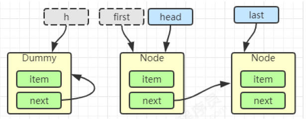 - 当节点总数等于 2 时(即一个 dummy 节点,一个正常节点)这时候,仍然是两把锁锁两个对象,不会竞争