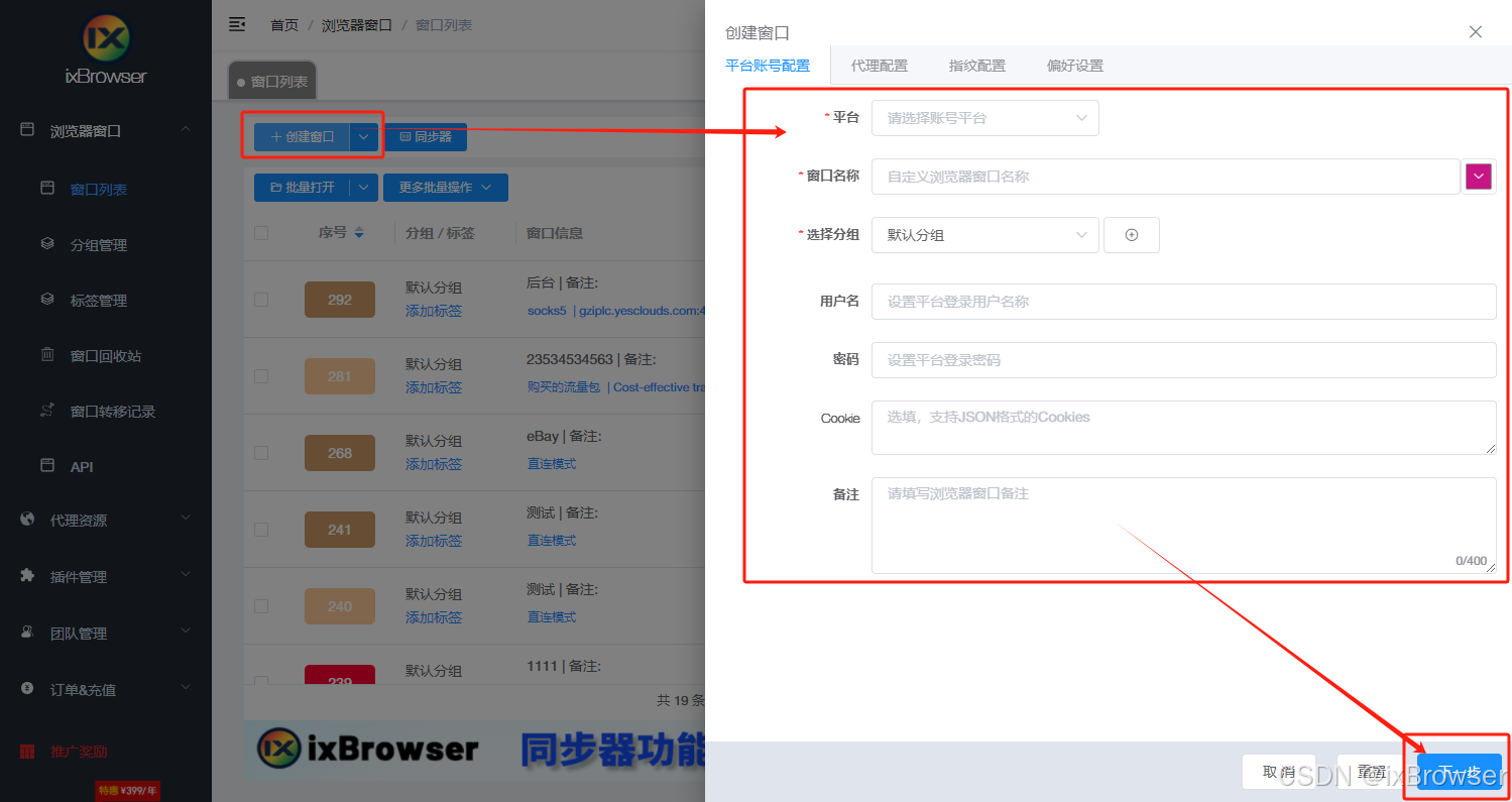 步骤2:点击创建窗口,选择平台并按照要求填写窗口的相关信息,填写完毕后点击下一步;