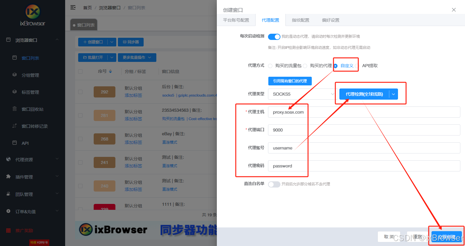 步骤4:回到ixBrowser,在代理配置界面中选择代理方式为“自定义”,选择代理类型为Socks5,并按照下方显示填写从SOAX复制的代理信息;