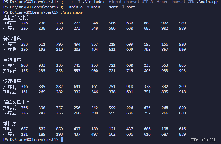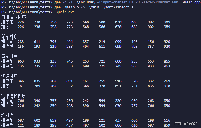 这步完成后,使用生成的.o文件链接静态库继续输入g++ main.o -o main sort\libsort.a进而生成可执行文件main.exe。调用exe文件则可以展示出整体测试功能输出结果如下: