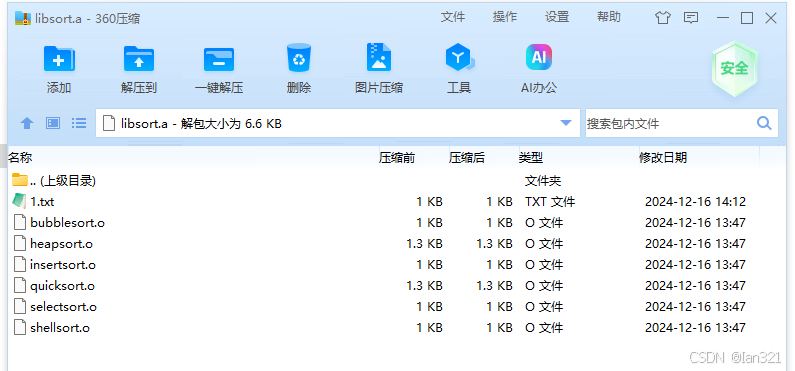 此时 ,所有的源代码都已经被编译成二进制文件。现在就到了将这些二进制文件打包生成静态库的时候了。不改变路径的情况下输入命令:ar rcs libsort.a *.o即可按照命名规则生成名为libsort.a的静态库文件。ar命令后面的参数意思是: