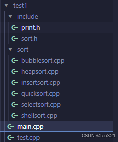 头文件位置在include文件夹中,sort.h包含所有排序方法的声明。print.h简单包含一个数组打印功能。对应的排序实现代码在sort文件夹中的对应代码文件中。项目的主函数在两个文件夹的目录test1中。test.cpp是写排序方法时的简单测试代码。