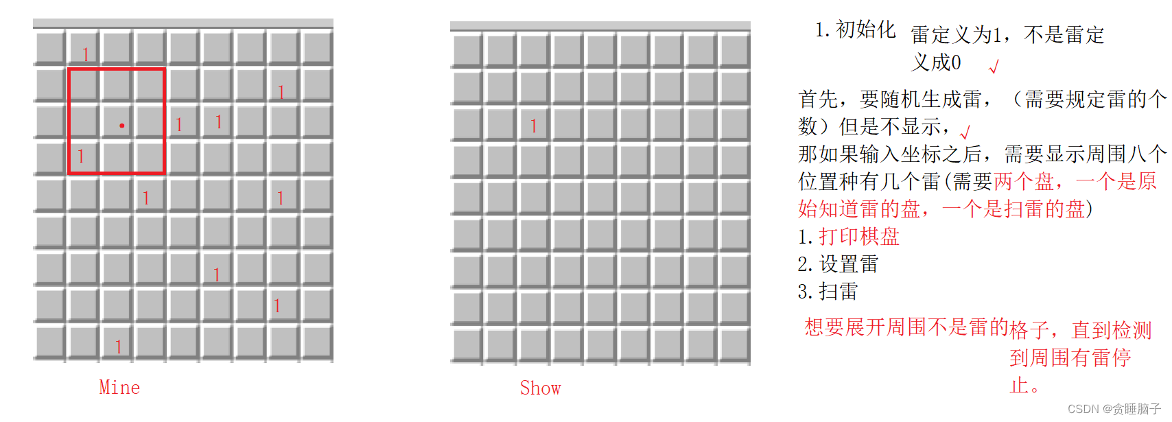 排雷成功:假设一共有10个雷,一共有9*9=81个格子,那如果我们一次雷都没有踩到并且全部格子都走完,我们就获胜。即9*9-雷数 = 所走的格子数,就胜利;如果9*9-雷数 > 所走的格子数,说明还没有走完,继续进行。