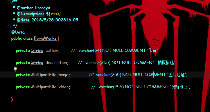 在前后台数据对接的时候,前端向后端发送一个form表单,提交数据,为了项目的直观性,一般我们要创建一个form实体,专门用来接收数据.如果前端在提交的数据中有文件类型,那么将对应的属性类型给成MultipartFile,它可以直接读取文件.