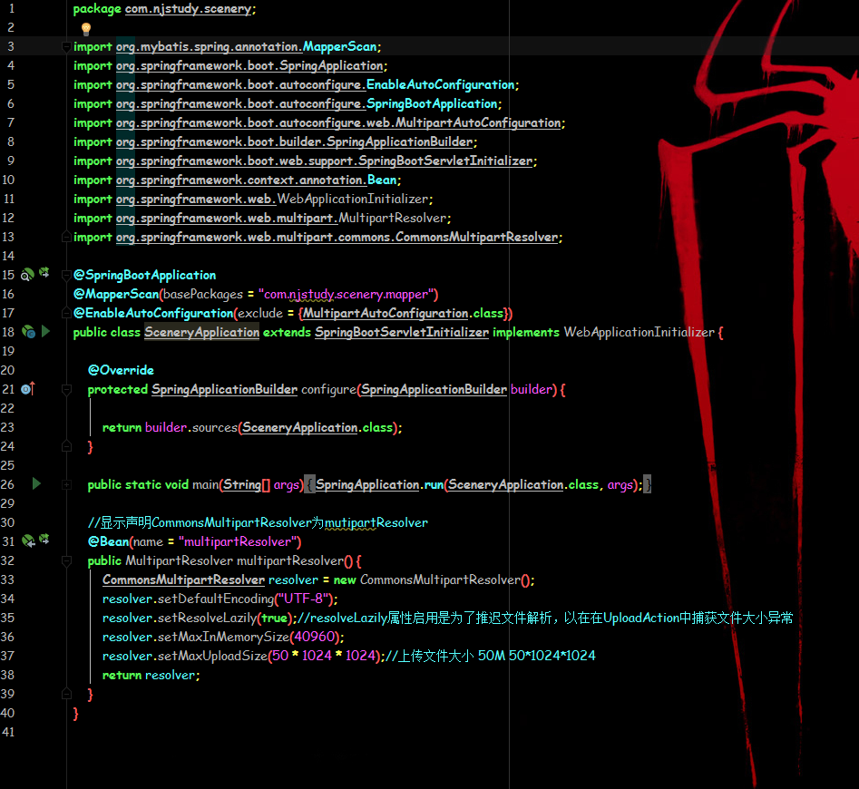 @EnableAutoConfiguration(exclude={MultipartAutoConfiguration.class}) 将文件上传的配置剖除