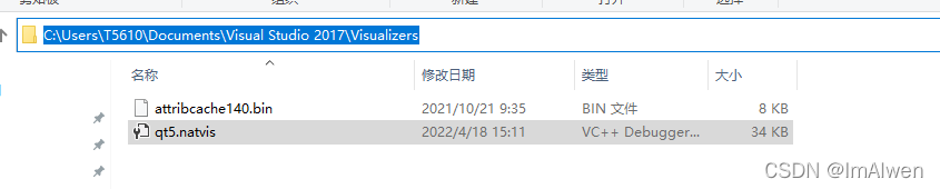 在如图所示目录下添加qt5.natvis文件。(C:\Users\T5610\Documents\Visual Studio 2017\Visualizers)
