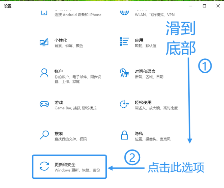 4.滑动到此界面的底部,点击“更新与安全”的选项。