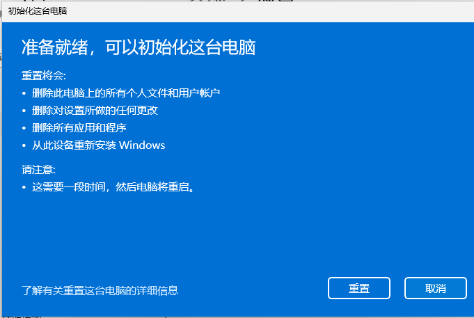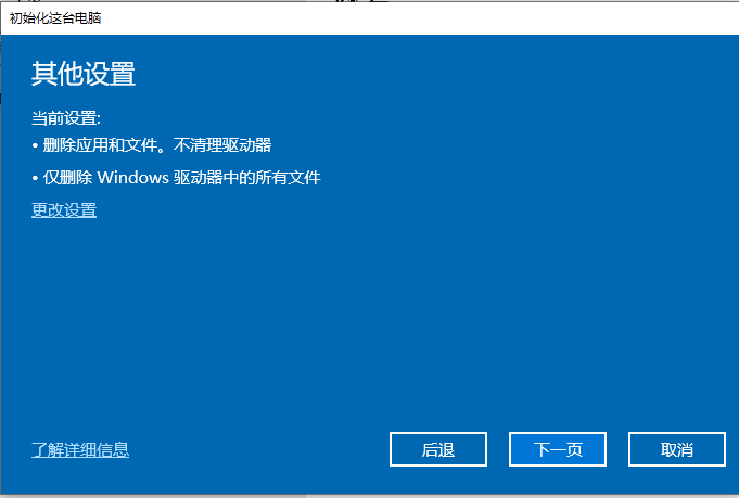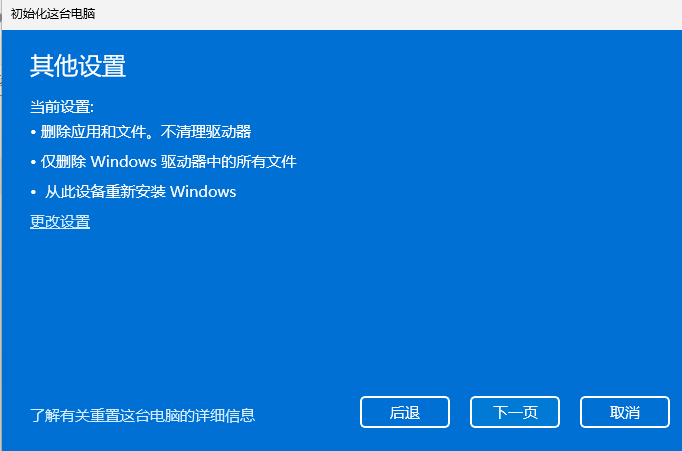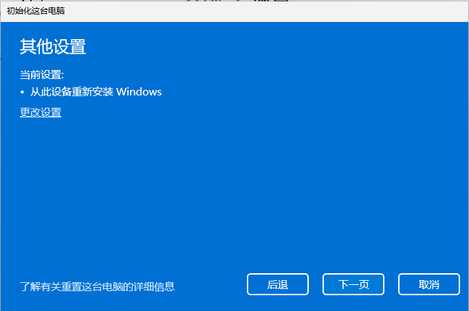 8.2.1若点击“删除所有内容”,点击“下一步”的按钮。(若不想继续重置,可以点击“后退”返回上一个界面或点击“取消”关闭此界面)
