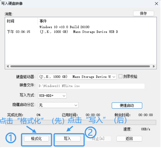 8.在弹出的窗口先点击"格式化"的按钮,再点击“写入”的按钮。