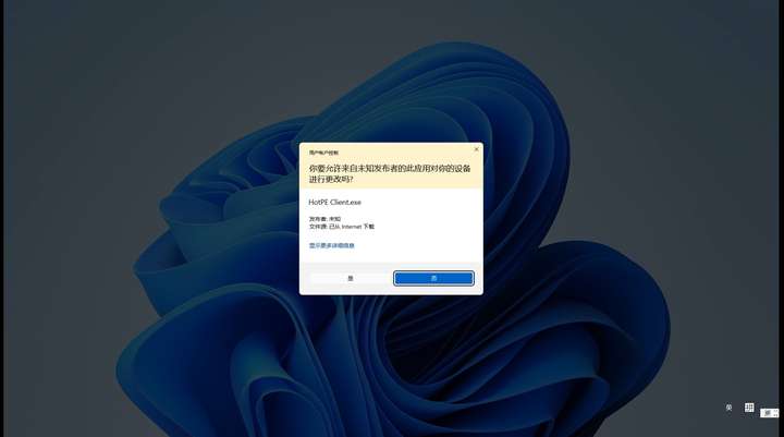 1.右键点击”以管理员身份运行”的选项,并在弹出的管理员批准窗口(也就是一个窗口显示着“你要允许来自未知发布者的此应用对你的设备进行更改”的文字,有些人没有这个窗口)中点击“是”。(以FirPE V2.0.2版本为例)
