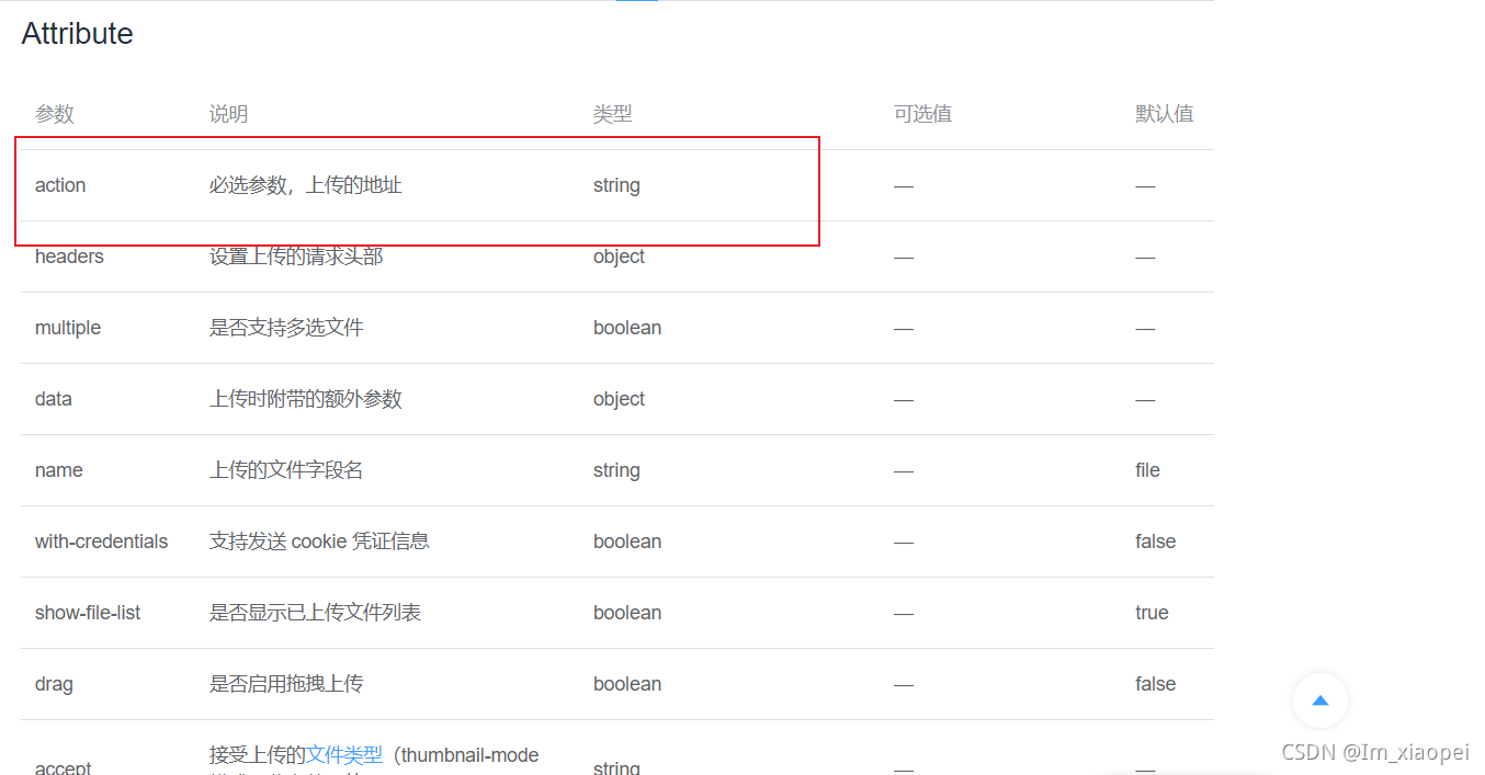 (1).绑定action属性,是element-ui组件的参数,就是图片上传的地址,就是我们要发送给后端的地址,值就是地址,“/api/upload?type=user”,解释一下,/api是处理跨域问题的配置,upload发送的接口,type是参数的类型,就是在哪个地方用