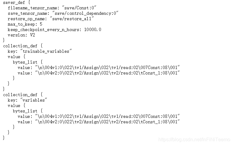 结论:collection_def每个存的是集合信息,graph_def存的是节点信息, 包含v1/assign, const, v1/read, add, save/const等等节点, 并不仅仅包含图中所示的3个节点, meta_info_def会存有类似上面的信息,大概T类似于java模板类的一种东西, saver_def主要存有关于save相关的信息。