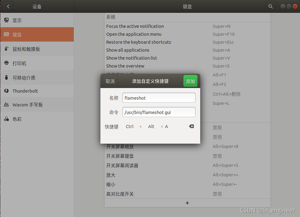 1.设置->设备->键盘->点击"+"->设置快捷键 2.设置为Ctrl+Alt+A,然后点击"添加"